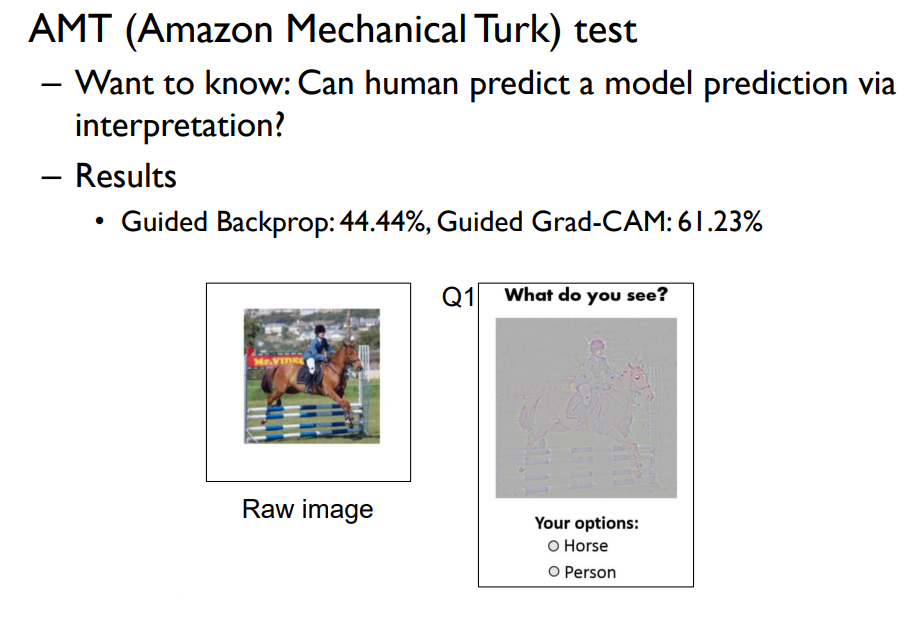 아래 그림은 AMT test를 통해 guided Backprop와 Guided Grad-CAM 방식을 비교한 경우고 여기서는 Guided Grad-CAM이 높은 점수를 얻었음