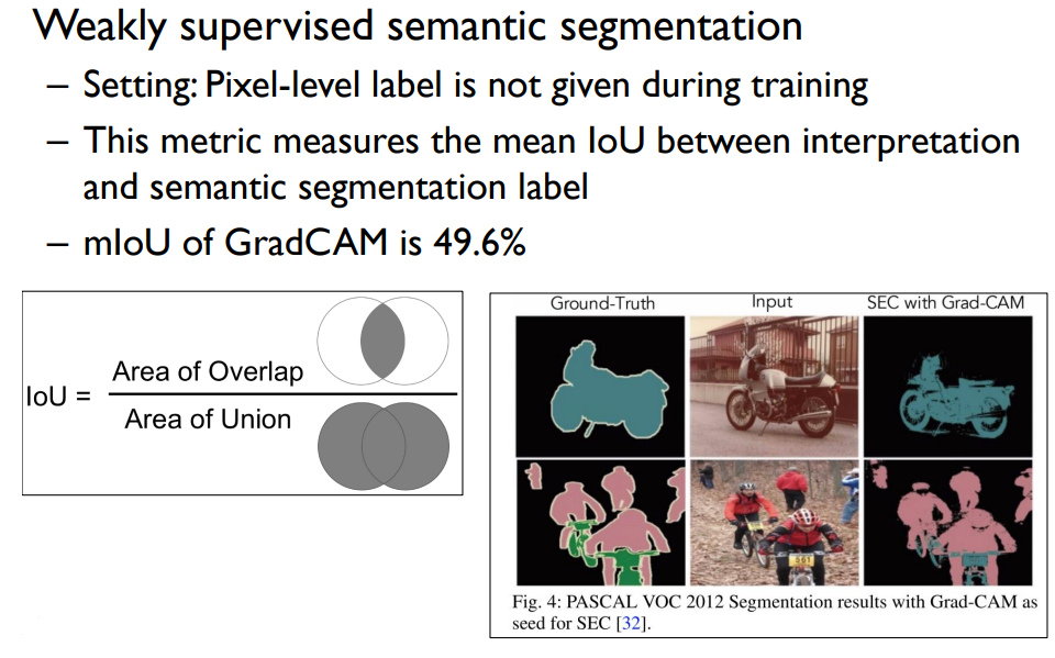 그렇게 구한 설명 즉, 이미지 내에서 중요한 pixel들을 하이라이트 했을 때 이를 이용해 pixel별 label 또는 segmentation map(SEC with Grad-CAM)을 구할 수 있음