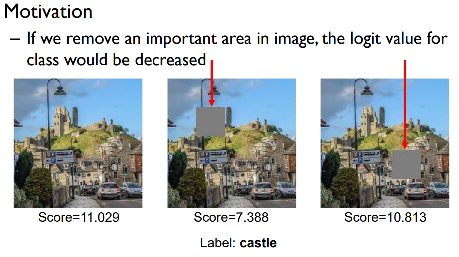 아래 그림에서 주어진 이미지를 보고 모델이 성이라고 분류했을 때 가리지 않은 이미지에서의 성에 대한 분류 score가 11인데, 일부를 가리고 모델에 넣으니 score가 떨어졌음