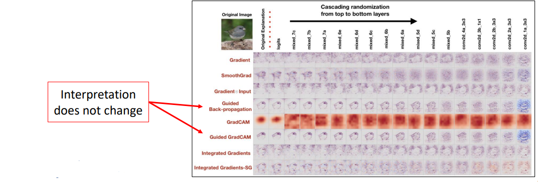 그 과정은 주어진 분류모델의 위쪽 레이어부터 모델의 계수들을 순차적으로 randomize한 후, 얻어지는 설명을 구해보는 테스트를 진행함
