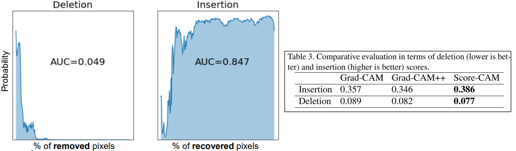 insertion은 백지 상태의 이미지에서 중요한 픽셀 순서대로 픽셀을 추가해가면서 classifier에 출력 score 값이 올라가는 그래프의 아래 면적을 구함 → 즉, 면적이 클수록 좋은 설명임