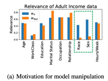 예를 들어 특정 model을 만든 개발자가 XAI 방법을 통해 model이 편향되었음을 알았을 때, 해당 model을 편향되지 않도록 고치게 하는 재학습을 진행하는 것이 아니라 model 계수(w)를 조금씩만 조작해서 model의 정확도는 차이가 없지만 XAI로 만들어낸 설명만 마치 공정한 model인 것처럼 나오게 조작이 가능함