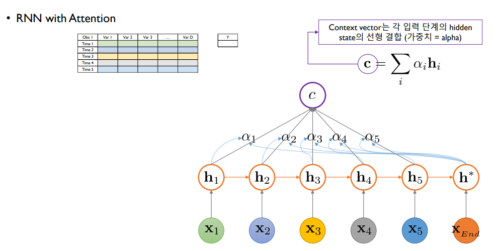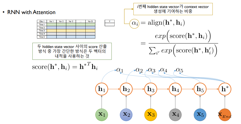 → 하지만 attention을 활용할 경우 중간 시점에 해당하는 hidden state vector들도 다시 한 번 최종적인 의사결정에 활용될 수 있는 기회를 얻게 됨