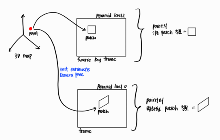 (추가적으로, map point의 기존 patch와 현재 frame에서 추정되는 patch의 모양, 크기, 위치가 모두 다르다. 그 이유는 map point가 처음 발견된 시점부터 현재 frame의 시점까지 camera pose가 변화했고, 그에 따라 camera에 찍히는 실제 환경의 공간상 변화도 발생하기 때문이다.)