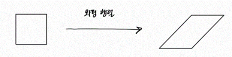 와핑 행렬은 아래 예시처럼 정사각형 pattern과 평행사변형 pattern이 존재할 때, 정사각형 pattern을 평행사변형 pattern으로 변형해주는 행렬 형태의 공식이다. 그래서 이 와핑 행렬을 정사각형을 구성하는 pixel들마다 적용해주게 되면, pixel들의 모양과 크기가 변화하면서 평행사변형 pattern을 구성하게 된다.