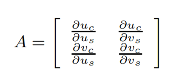 이처럼 와핑 행렬을 구하는 방법을 그림으로 확인했으니, 와핑 행렬의 수식 표현을 살펴보도록 하자. 와핑 행렬의 각 요소는 map point의 기존 patch(S)의 pixel 위치 변화에 따른 map point의 현재 frame에서 추정되는 patch(C)의 pixel 위치 변화율로 표현할 수 있다.