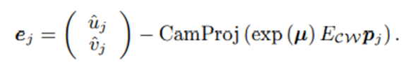 첫 번째 좌표는 patch search로 구한 현재 frame에서 map point의 patch 좌표(label)를 의미하고, 빼기 뒤에 나오는 두 번째 좌표는 계속해서 업데이트되는 camera pose와 map point를 내적한 후 2D image plane에 투영한 좌표(predict)이다.