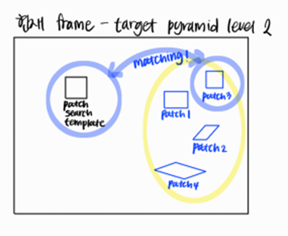 1. 현재 frame의 target pyramid level 안에서 매칭되는 patch가 존재할 법한 원형 검색 영역 내 FAST-corner algorithm을 수행한다.