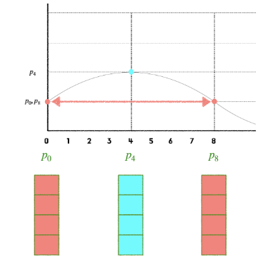 그런데 sin과 cos 함수는 주기 함수이기 때문에 해당 함수를 변형하지 않고 바로 사용하면, 아래 그림처럼 p0와 p8에 위치한 단어처럼 positional embedding vector 값이 동일해지는 경우가 발생한다.